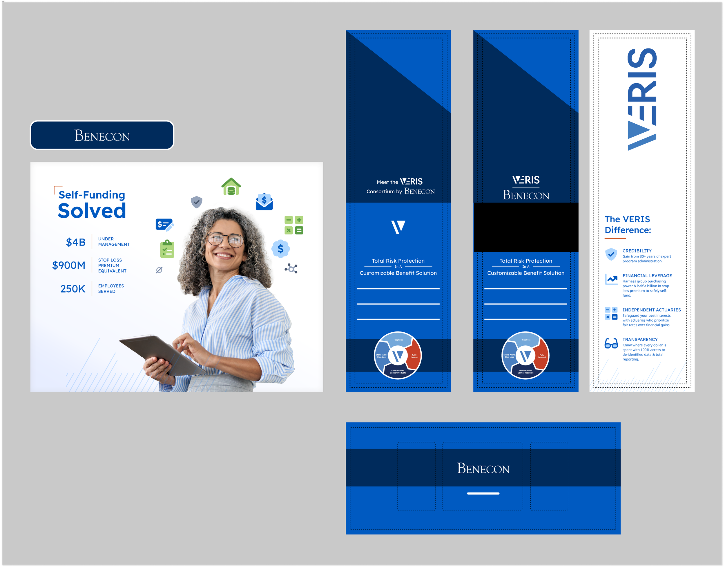 As an established employee benefits company, Benecon hosts and attends multiple events a year. They brought in my team to create graphics, booths, and webpages to support their mission of “self-funding solutions”.