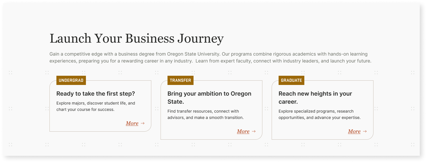 - Gave each audience distinct visual markers repeated throughout the site.